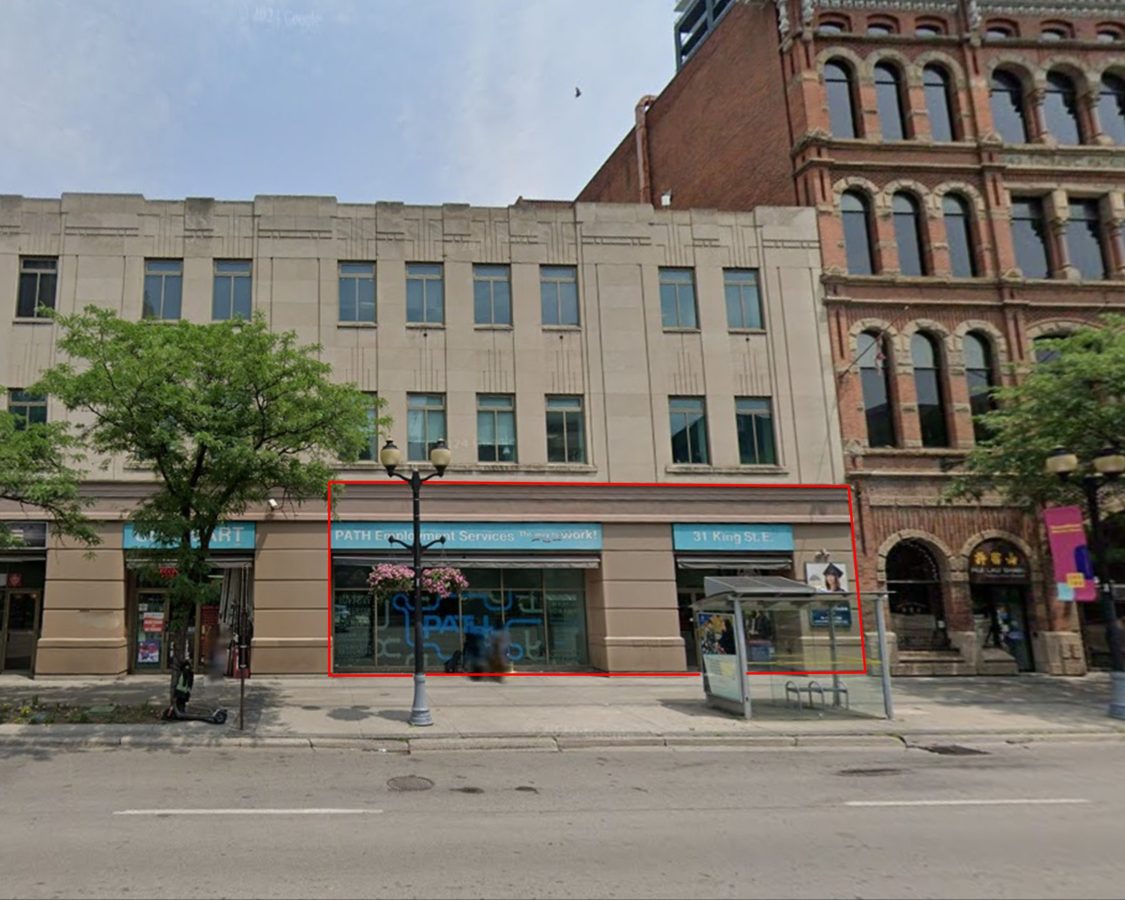 Office / retail space for lease in downtown Hamilton. Prime ground floor office or retail space in the heart of the downtown core with excellent exposure, high foot and major bus and future LRT stops in front. Close proximity to all downtown services, and amenities. Space currently improved with many larger private offices and work stations, reception, large meeting/board rooms, storage area and kitchen suitable for most office, educational, retail or other uses. Space divisible as follows: front office area 6,094sf and rear office area 1,040sf rentable. Immediate possession.