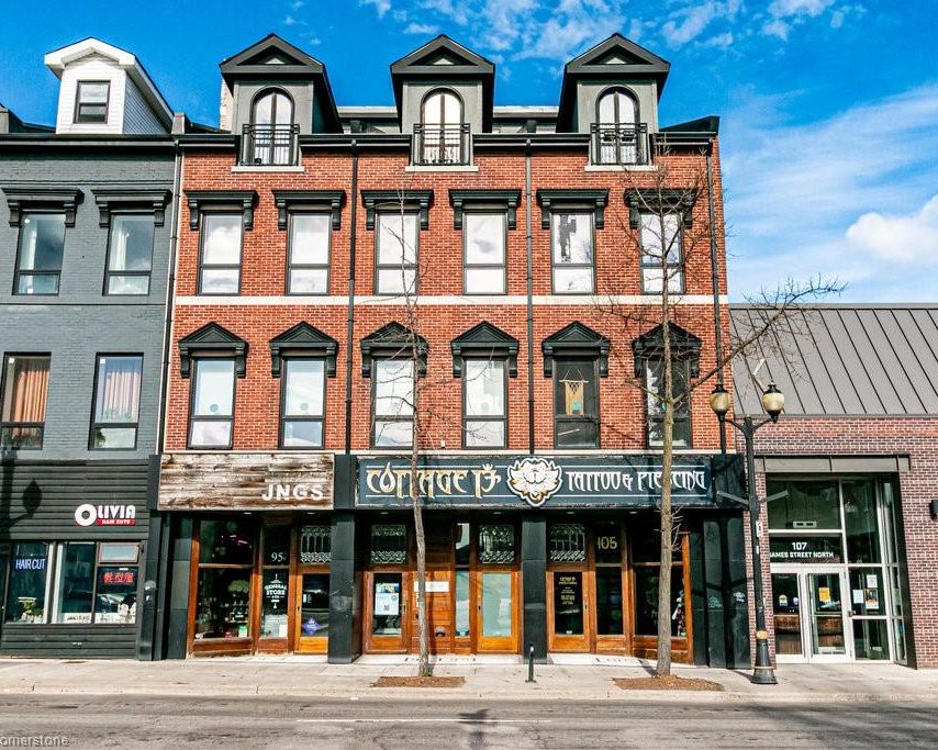 Mixed-use building for sale in Hamilton. A+ Investment Opportunity! Completely renovated and remodeled mixed use buildings with a 33 car parking lot. 3 x Four Storey Victorian buildings with 2 retail main floor units, 2 office units and 4 apartment units + 33 car parking lot accessed off Vine Street + additional tenant parking behind the buildings. 7357 square feet of top quality mixed use space + 9600 sq. ft. parking lot. Fabulous location and exposure due to orientation of the streets All units have own HVAC and hydro. Quality workmanship, design and finishes throughout. Zoning permits maximum building height—44 metres, A truly rare opportunity and stellar investment for a long term hold. || PARKING SPACES: (37) | UNITS: (2) Office (5,508sf), (4) Residential, (2) Retail (1,849sf)| WASHROOMS: 8 ||